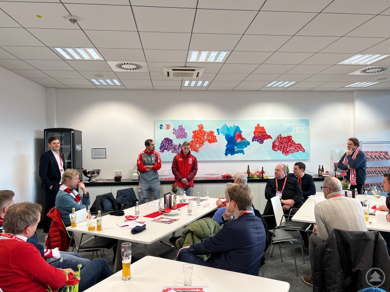 Das Tagesprogramm für die Unternehmergruppe aus Niederbayern gestaltete sich attraktiv. Abgeholt wurden die Teilnehmenden mit dem offiziellen Mannschaftsbus von Jahn Regensburg. Nach der Ankunft am Jahnstadion stand eine Stadionführung auf dem Programm, die den Unternehmern selten gewährte Einblicke ermöglichte: Unter anderem wurden die Mannschaftskabine und der Raum für Pressekonferenzen gezeigt, auch ein Gang direkt an den Spielfeldrand war möglich.