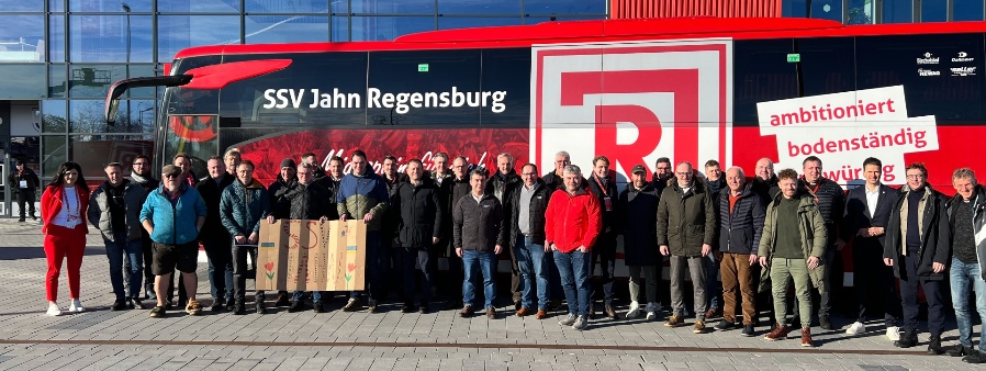 Das Tagesprogramm für die Unternehmergruppe aus Niederbayern gestaltete sich attraktiv. Abgeholt wurden die Teilnehmenden mit dem offiziellen Mannschaftsbus von Jahn Regensburg. Nach der Ankunft am Jahnstadion stand eine Stadionführung auf dem Programm, die den Unternehmern selten gewährte Einblicke ermöglichte: Unter anderem wurden die Mannschaftskabine und der Raum für Pressekonferenzen gezeigt, auch ein Gang direkt an den Spielfeldrand war möglich.