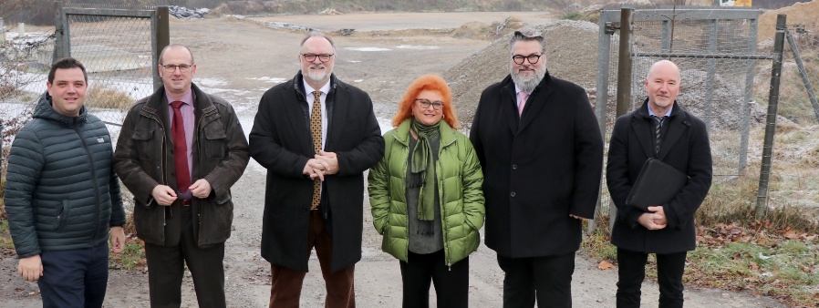 Freuen sich auf die künftige Nutzung des ehemaligen Bundeswehr-Sportplatzes im Hintergrund: 3. Bürgermeister Armin Dickl, Peter Greil von der BImA, Oberbürgermeister Jürgen Dupper, die weitere Stellvertreterin des Oberbürgermeisters Erika Träger, 2. Bürgermeister Andreas Rother und Liegenschaftsreferent Herbert Zillinger.