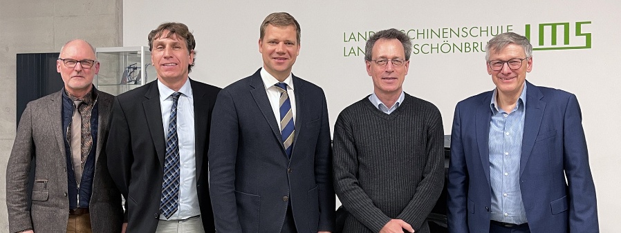 Christian Beckmann (Leiter Landmaschinenschule), Michael Zehentbauer (Leiter Staatl. Fachschule für Gartenbau), Dr. Olaf Heinrich (Bezirkstagspräsident von Niederbayern), Prof. Dr. Fritz Pörnbacher (Präsident Hochschule für angewandte Wissenschaften) und Prof. Dr. Josef Hofmann (Projektkoordinator Hochschule für angewandte Wissenschaften Landshut).