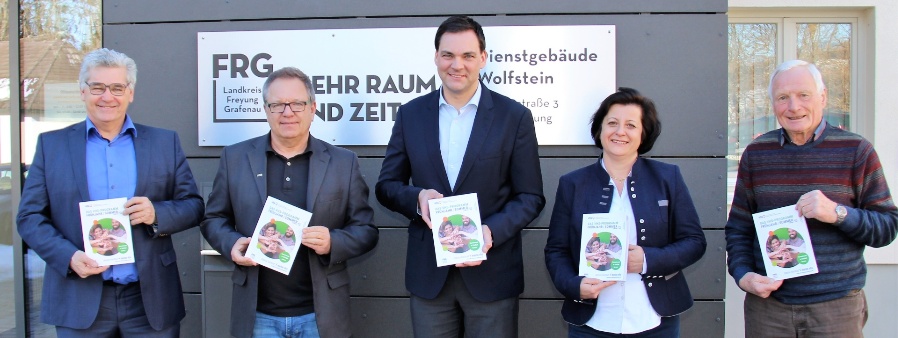 Mit den ersten druckfrischen Exemplaren des neuen vhs-Semesterprogramms Frühjahr/Sommer 2023 in den Händen freuen sich vor dem Landratsamt auf die vielen interessanten Kurse (v.l.n.r.): Abteilungsleiter Siegfried Wilhelm, vhs-Geschäftsführer Michael Dietz, Landrat Sebastian Gruber, Stellv. vhs-Geschäftsführerin Klara Köck und ehrenamtlicher vhs-Leiter Willi Schindler.