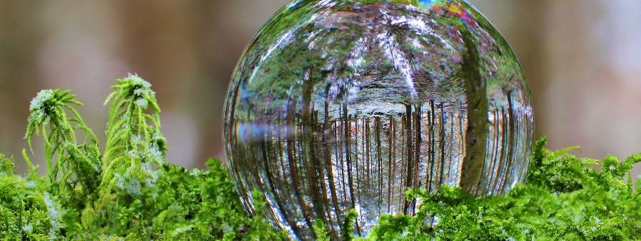 Hier sieht man den Wald im Fokus meiner Makrokamera mit Blick durch eine Glaskugel. Die Schwierigkeit dabei liegt in den Klarstellung des Objektivs, da die Kugel ja eine Wölbung aufweist und dadurch der Fokus stark verzerrt wird. Schmale Fichten spiegeln sich spiegelverkehrt, also auf dem Kopf stehend, in der Kugel. An manchen Stellen wird das Licht gebrochen und in Regenbogenfarben zerlegt. Auch so kann der Wald interessant sein, spannend und einfach einmal anders!