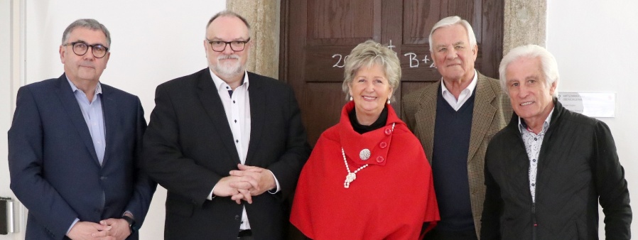 Oberbürgermeister Jürgen Dupper (2. von links) freut sich mit Präsident Georg Steiner (von links), Vizepräsidentin Sonja Blaschke-Pistracher, Ralf Blaschke und Karl Franz Dembeck von der DÖG auf die Aktivitäten 2023 und das Jubiläum im kommenden Jahr.