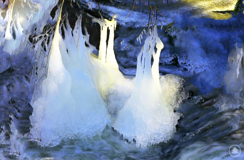 Die im Foto abgebildeten Eisfiguren sehen wie Glocken aus und hängen an dünnen Strauchzweigen, leicht ins Wildwasser getaucht sind. Sie sind im Landschaftsschutzgebiet der naturromantischen Saußbachklamm nahe Waldkirchen entstanden. Das Bild habe ich am 9. Februar, kurz vor der Mittagszeit, aufgenommen, gerade als die aufsteigende Sonne durch die Baumäste blinzelte und ihre Strahlen fleckenhaft auf die Eisgebilde warf. Wie leuchtende Lampions wirkten diese im Bachbett, das an anderen Stellen noch im Schatten lag. Winterliche Kostbarkeiten wie diese sind als Naturschätze zu sehen, die nicht jedes Jahr zur kalten Jahreszeit anzutreffen sind und keine allzu lange Lebensdauer haben. Gefrorenes Wasser erscheint hier wie eine „klingende Sinfonie“, wie eine kleine Wunderwelt, in der „Väterchen Frost“ bei knackigen Temperaturen deutlich seine Handschrift hinterlassen hat.