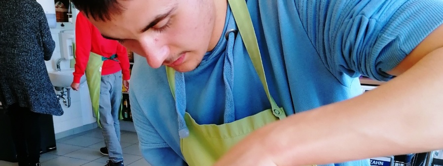 Beim „Tag der Erde“ in St. Severin: Nico stellt den Teig für vegane Burger her.