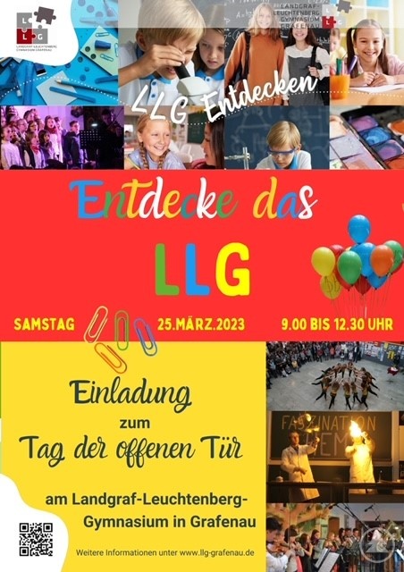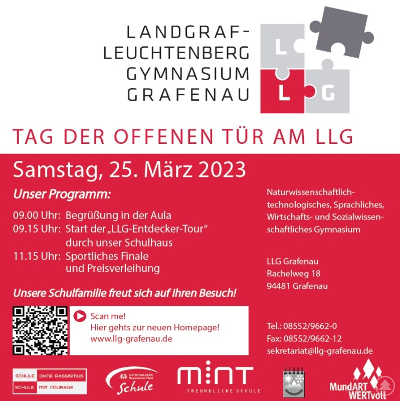 Am Samstag, den 25. März, lädt das Landgraf-Leuchtenberg-Gymnasium Grafenau von 9.00 Uhr bis 12.30 Uhr wieder zum „Tag der offenen Tür“ ein. Die Schulfamilie freut sich, wenn viele interessierte Viertklässler mit ihren Eltern das LLG besuchen.