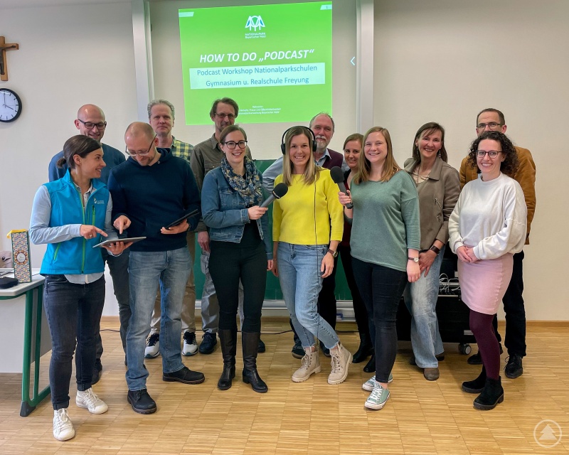 Dieser Nachmittag am Gymnasium Freyung stand ganz im Zeichen von Podcasts. Bereits seit 2020 nutzt der Nationalpark Bayerischer Wald dieses moderne Medium, um seine Botschaften neuen Zielgruppen näher zu bringen - und das durchaus erfolgreich. Wie genau das „Podcasten“ aber funktioniert, wollten nun auch die beiden Partnerschulen, das Gymnasium und die Realschule Freyung, erfahren. Bei einem Workshop gab Julia Reihofer, Mitarbeiterin der Medien- und Öffentlichkeitsarbeit des Nationalparks, 13 interessierten Lehrkräften einen spannenden Einblick in die Entstehung der Hörspielreihen des Schutzgebietes. „Es war für uns sehr spannend zu erfahren, was es für einen gelungenen Podcast tatsächlich alles benötigt. Vom richtigen Thema über die Recherche und Planung bis hin zur Aufnahme- und Schnitttechnik. Mit `einfach nur aufs Knöpfchen drücken und loslegen´ ist es noch lange nicht getan“, zeigte sich Biologielehrer Michael Behringer vom Gymnasium Freyung beeindruckt: „Wir sind begeistert, dass wir durch die Kooperation mit dem Nationalpark nun einen fachkundigen Einblick erhalten haben. Podcasts sind ein tolles Medium, das Fantasie und Kreativität fördert und das wollen wir auch für unsere Schüler nutzen.“