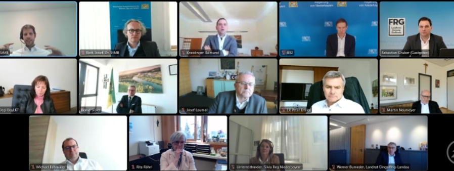 Max Meier vom Bayerischen Staatsministerium für Wohnen, Bau und Verkehr (oben links) informierte über den aktuellen Stand des Deutschlandtickets. Bei der virtuellen Tagung des Bezirksverbands Niederbayern des Bayerischen Landkreistages sprachen sich alle Anwesenden für geregelte Finanzierungsrichtlinien aus.
