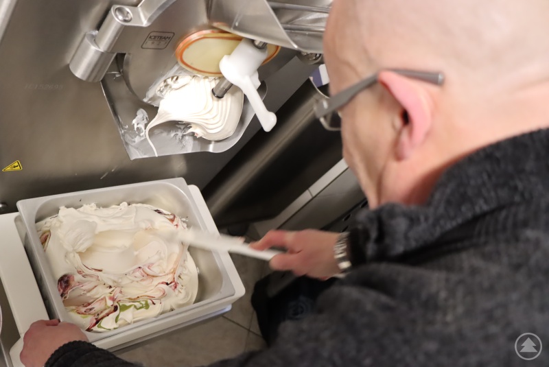 Und so macht sich ihr Vater Claudio, der für die Neukreationen im Hause zuständig ist, daran, die gemeinsam ausgetüftelte Idee auszuprobieren. Zunächst einmal kommt ein tiefblauer Eimer auf die Waage. Hier kommen die Grundzutaten hinein – säuberlich abgewogen. Zucker, Fruchtzucker, Magermilchpulver. „Das ist die Milchbasis, die dem Eis später die Struktur gibt“, erzählt der erfahrene Eisschöpfer. Schließlich fließt „reine Haselnuss“ ins Gefäß, gefolgt von einer satten Menge Milch. Etwas über 4,3 Kilogramm zeigt die Waage am Ende an. Nun aber erstmal ab in die Rührmaschine. „Das muss jetzt schön durchgemixt werden“, erklärt Claudio. Danach ist die Eismaschine an der Reihe. Erstmal geht’s aber in die vermeintlich falsche Richtung, denn die Masse wird vorsichtshalber auf 65 Grad erhitzt. „Damit mögliche Bakterien ganz sicher verschwinden“, so der Eisexperte. „Außerdem wird das Eis so auch cremiger.“ Diesen Schritt praktiziert man übrigens nur bei Milcheis-Sorten. „Fruchteis ist nämlich gänzlich ohne Milch oder Sahne, da kann man sich das Erhitzen schenken.“ Dafür seien die Kreationen auf Fruchtbasis dann aber auch vegan. Bei diesem Merkmal muss unser WALDgeist-Eis aufgrund der Milch leider passen. Ein paar Minuten später hat die Maschine den heißen Teil der Produktion erledigt. Nun wird in die Kältekammer umgepumpt. Wieder ein paar Minuten später ist die frostige Grundmasse so weit fertig. Die zähe Masse schlängelt sich durch Edelstahl-Schlitze nach draußen, wo Claudio mit dem Spachtel schon darauf wartet, das hellbraune Glück abzuschöpfen. Langsam verteilt er es in die eisgekühlte Schale, die er unter der Öffnung platziert hat. Dabei schöpft er immer wieder Waldbeeren hinzu, gefolgt von gut portionierten Pistazien-Spritzern. Am Ende ist eine schön angerichtete, mächtige Schale WALDgeist-Eis entstanden, die nun aber nochmal schockgefrostet wird. Drei, vier Minuten bei unter minus 30 Grad und die süße Leckerei ist endgültig fertig. Jetzt kommt sie entweder in den normalen Gefrierschrank, bei rund minus 10 Grad, oder direkt in die Ausgabetheke.