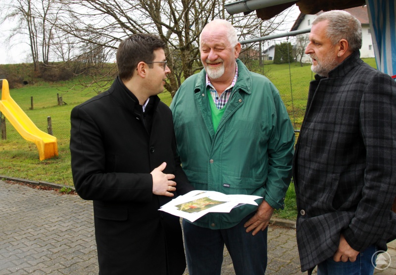 Bürgermeister Martin Pichler (v.l.), Dorfgemeinschaftsvorsitzender Andreas Jobst und Gemeinderat Helmut Aigner freuten sich am Dorftreff Gumpenreit über einen großen Schritt in Richtung einfacher Dorferneuerung.