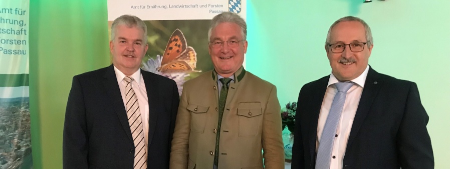 Ministerialdirektor Hubert Bittlmayer (l.) hat bei der feierlichen Amtsübergabe Robert Schnellhammer (m.) in den Ruhestand verabschiedet und Helmut Ramesberger (r.) zum neuen Leiter des Amtes für Ernährung, Landwirtschaft und Forsten Passau ernannt.