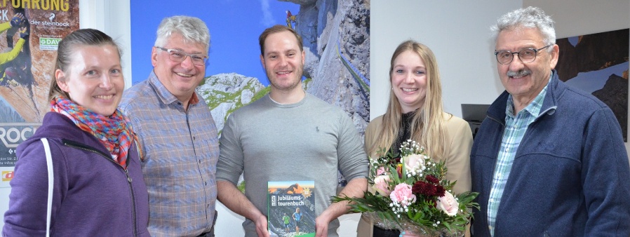 Gesagt, getan. Ein wenig mit Freunden ausgetauscht, gegoogelt und schließlich der Griff zum Handy – „online ist so eine Anmeldung gleich gemacht“, freut sich das Paar den Schritt endlich getan zu haben. Scheinbar zum richtigen Zeitpunkt, denn Monika Schätzl und Matthias Schmid sind mit ihrer Anmeldung das 8.000ste und 8.001ste Sektions-Mitglied. „Schön, wenn man gleich so persönlich und herzlich in einem so großen Verein begrüßt wird“, freuen sich die beiden bei einem kleinen Empfang in der Geschäftsstelle mit dem Vorsitzenden Lothar Schramm, Schatzmeister Bernhard Pappenberger sowie der künftigen Geschäftsstellenleiterin Nina Bauer. „Wir haben uns ganz bewusst und überlegt für die Sektion Passau entschieden: Natürlich aufgrund der Nähe zur Heimat, den neuen Kontakten, Vergünstigungen, außerdem hat man direkte Ansprechpartner vor Ort, die Bergrettung ist inklusive und wir profitieren von dem vielfältigen Programm“, so das junge Paar. So stehe die nächste Tour für heuer schon fest: „Wir werden auf jeden Fall die Passauer Hütte besuchen und uns die Loferer und Leoganger Steinberge ansehen“, so Matthias Schmid.