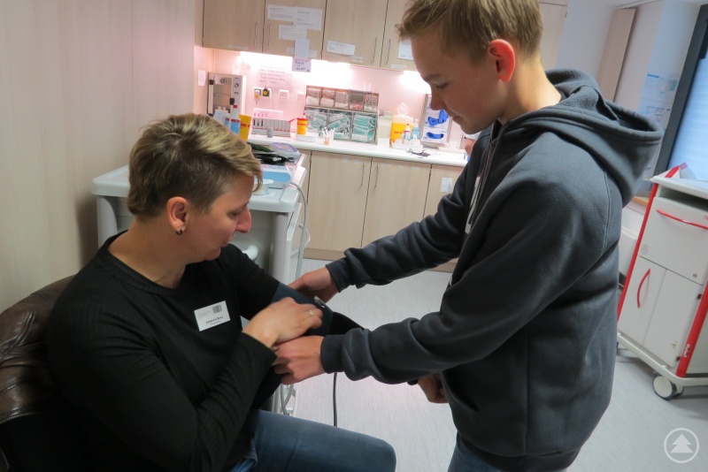Weiter ging es dann zu Diagnostikeinrichtungen bis hin zu einer neurologischen Station. Hier erklärte ihm eine Auszubildende, worauf es beim Blutzuckermessen ankommt. Bei Johanna Brey durfte er selbst die Messung durchführen. „Alles im Normbereich“, bestätigte Johanna. Spannend war auch der Besuch in einem Patientenzimmer, wo eine Immunadsorption angewandt wurde. Johanna erklärte ihm das Prinzip der „Blutwäsche“, bei der Antikörper, die das Nervensystem schädigen, gezielt aus dem Körper herausgefiltert werden.