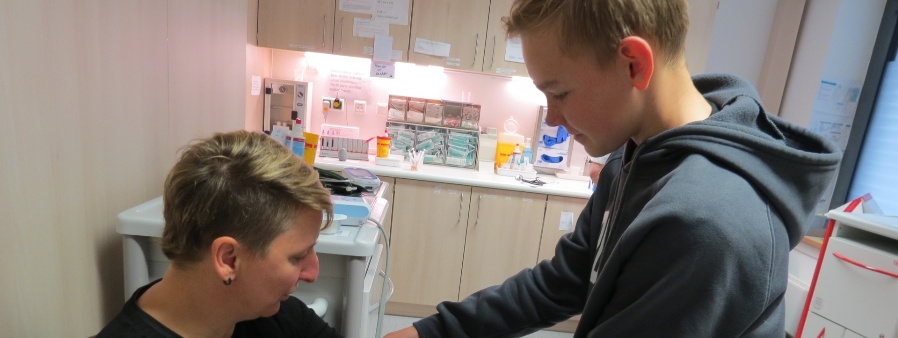 Weiter ging es dann zu Diagnostikeinrichtungen bis hin zu einer neurologischen Station. Hier erklärte ihm eine Auszubildende, worauf es beim Blutzuckermessen ankommt. Bei Johanna Brey durfte er selbst die Messung durchführen. „Alles im Normbereich“, bestätigte Johanna. Spannend war auch der Besuch in einem Patientenzimmer, wo eine Immunadsorption angewandt wurde. Johanna erklärte ihm das Prinzip der „Blutwäsche“, bei der Antikörper, die das Nervensystem schädigen, gezielt aus dem Körper herausgefiltert werden.