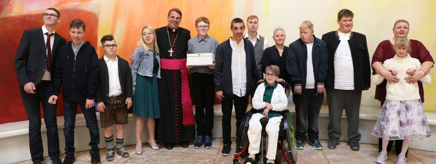 Bischof Stefan Oster im Kreise der elf Firmlinge der St. Ulrich Schule, Pocking.