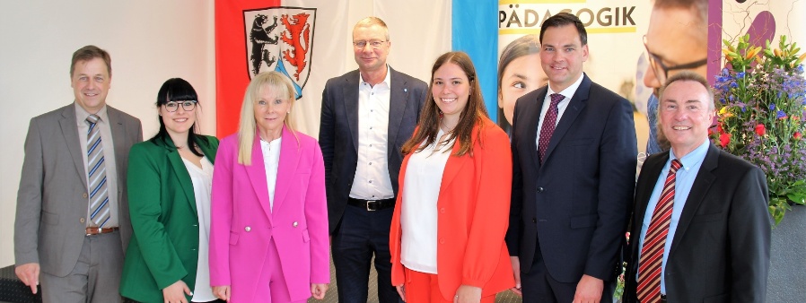 Freuen sich über den erfolgreichen Schulstart und die gelungene Eröffnung der Fachakademie für Sozialpädagogik Grafenau (v.l.n.r.): Bürgermeister Alexander Mayer, Schülersprecherin Lucy Lichtenauer, Schulleiterin Elvira Wudy-Engleder, Ltd. Regierungsschuldirektor Reiner Sagstetter, Schülersprecherin Charlotte Pauli, Landrat Sebastian Gruber und Außenstellenleiter Robert Eberle.