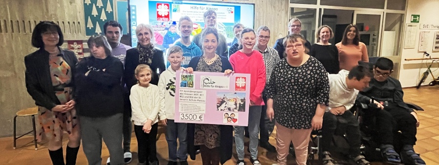 Frau Mouna Sabbagh von „Hilfe für Aleppo e. V.“ war als Gründerin und Stellvertreterin des Vereins an die Schule gekommen, um die gesammelten Gelder in Form eines Spendenschecks entgegenzunehmen.