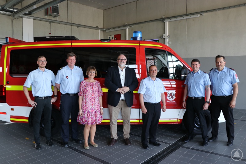 Oberbürgermeister Jürgen Dupper (Mitte) freut sich gemeinsam mit (von links) dem 2. Vorstand Tobias Helldobler, Stadtbrandrat Andreas Dittlmann, Ordnungsreferentin Karin Schmeller, Kommandant Markus Freundorfer, dem stellvertretenden Kommandanten Severin Putz und dem 1. Vorstand Stephan Blendel über den neuen Mannschaftstransportwagen.