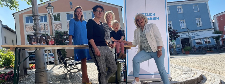 Evi Blach, Nina Stelzl sowie die beiden stellvertretenden Landrätinnen Hilde Greiner und Helga Weinberger (v.l.) erklärten schon den kleinsten Besucherinnen und Besuchern des Wochenmarkts, warum fairer Handel wichtig ist.