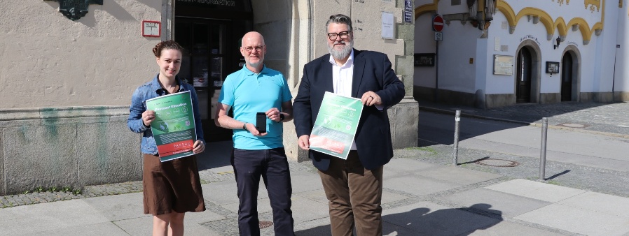 Bürgermeister Andreas Rother (rechts) präsentiert zusammen mit Wolfgang Seiderer, Referent für Bauen und Umwelt (Mitte) und Frau Carolin Stadler, städt. Umweltamt (rechts) das diesjährige Plakat zum Klimathon.