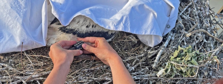 Geschützt unter einer Decke bekamen die vier Jungstörche ihre Erkennungsringe angelegt.