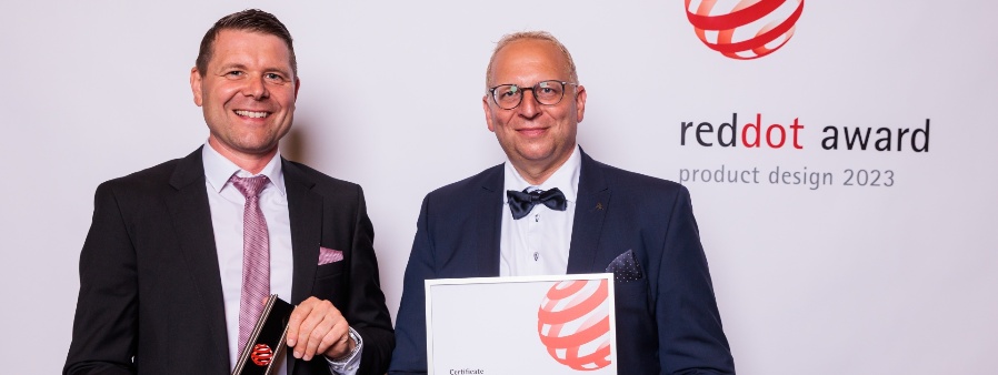 Jürgen Greipl (li.) und Manuel Pledl (r.) mit dem Red Dot Design Award und Urkunde