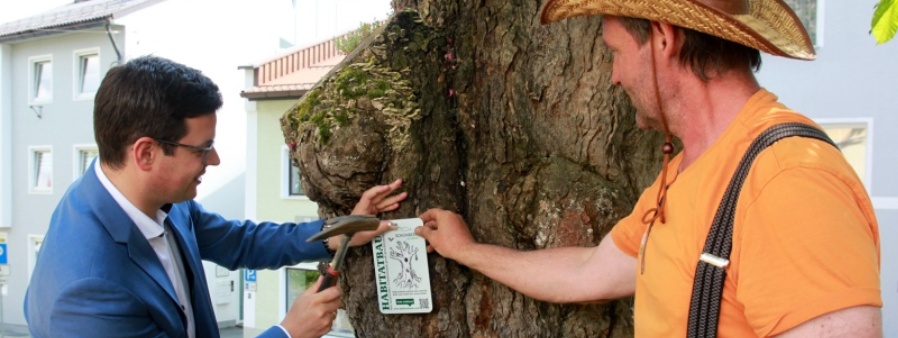 Bürgermeister Martin Pichler durfte das erste von fünf Schildern an Schönberger Habitatbäumen anschlagen, die auf ihren Wert als Teil des Ökosystems hinweisen.