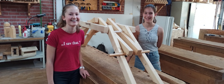 Die Brücke hält – die stolzen Realschülerinnen mit ihrer fertigen Leonardo-Brücke.