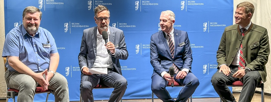 Rege Diskussion über Genossenschaften: Von rechts Bezirkstagspräsident Dr. Olaf Heinrich, Carsten Clemens, Vorstandsvorsitzender der VR-Bank Landau-Mengkofen, Moderator Bertram Vogel und Max Riedl, Gründungsberater im Genossenschaftsverband Bayern. Foto: Bezirk Niederbayern