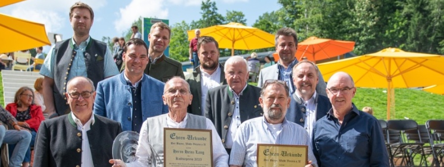 Sie sind „Motoren“ für die kulturelle Entwicklung der Stadt Freyung und des gesamten Unteren Bayerischen Wald, sind seit Jahrzehnten engagiert und wurden deshalb am Sonntag mit dem Kulturpreis des Bayerischen Wald-Vereins ausgezeichnet. „Uli Dittlmann und Heinz Lang sind überaus verdiente Persönlichkeiten, eine große Bereicherung für den Unteren Bayerischen Wald und zwei würdige Kulturpreisträger 2023“, so Wald-Vereins Präsident Sebastian Gruber in seiner Begrüßung auf der Hauptbühne der Landesgartenschau. Dort hob auch Bezirkstagspräsident Dr. Olaf Heinrich die Bedeutung des Kulturpreises hervor, der von einem Verein verliehen werde, der „Herkunft und Zukunft verbindet und Kultur weiterentwickelt“. Doch dazu brauche es immer Personen, die Verantwortung übernehmen, weshalb der Kulturpreis auch aus Sicht des Freyunger Bürgermeisters hochverdient an die beiden Preisträger gehe.