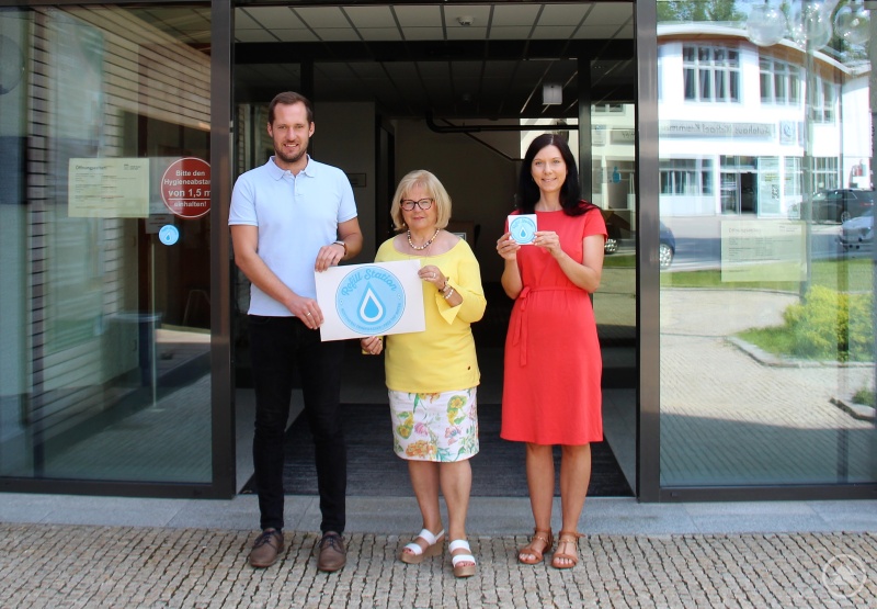 Gerade in den heißen Sommermonaten ist eine ausreichende Trinkmenge als Schutz vor der Hitze unerlässlich. Im Hitzeaktionsplan des Landkreises Freyung-Grafenau, welcher durch die Gesundheitsregion plus in Kooperation mit dem Fachbereich Klimaschutz und Nachhaltigkeit am Landratsamt erstellt wurde, stellt die Trinkwasserbereitstellung im öffentlichen Raum einen wichtigen Aspekt dar. Es gibt viele öffentliche Gebäude und Geschäfte, die grundsätzlich bereit sind, kostenlos Trinkwasser bereitzustellen und mitgebrachte Trinkflaschen aufzufüllen“, so Eva Osterer, Klimaschutzmanagerin am Landratsamt Freyung-Grafenau. Hier setzt die Kampagne Refill-Deutschland an. Die Idee ist simpel: Der blaue Refill-Sticker im Eingangsbereich kennzeichnet Zapfstellen, in denen kostenlos Wasser in mitgebrachte Gefäße aufgefüllt werden darf. Helga Weinberger, stellv. Landrätin des Landkreises Freyung-Grafenau: „Gerade im Sommer, besonders bei Hitzewellen, ist es wichtig, genug zu trinken. Im Dienstgebäude Königsfeld bieten wir deshalb bereits seit einiger Zeit eine Refill-Zapfsäule an. Wir hoffen, dass sich weitere öffentlich zugängliche Gebäude im Landkreis an der sinnvollen Aktion beteiligen.“