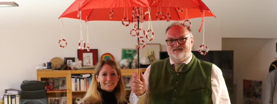 Die Wasserwacht Ortsgruppe Hals hat heuer Grund zum Feiern, sie besteht seit 75 Jahren. Die Verantwortlichen planen dazu ein Fest am Halser Stausee, welches am 19. August 2023 stattfinden wird. Um Oberbürgermeister Jürgen Dupper als Schirmherrn zu gewinnen, kam die Vorsitzende der Ortsgruppe Hals, Stefanie Stogel, ins Alte Rathaus und überbrachte als Geschenk einen von der Jugendgruppe verzierten Schirm.