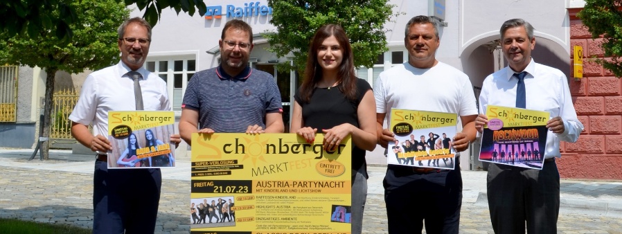 Die Organisation ist gemacht, schönes Wetter bestellt und den Rest erledigen Top Musik-Acts, stimmungsvolles Programm für jedes Alter sowie eine Rundum-Partyversorgung für hoffentlich viele Gäste. Darauf freuen sich die Direktoren der Raiffeisenbank Am Goldenen Steig Helmut Scheibenzuber (l.) und Kurt Gampe (r.) mit Geschäftsstellenleiterin Andrea Loibl sowie Organisator Hans-Jürgen Perl (2.v.l) und stellvertretender Bürgermeister sowie Veranstalter Herbert Kern jun.