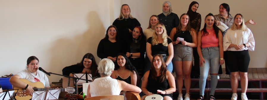 Die Jugendlichen wurden herzlich mit ihren Angehörigen empfangen und gleich ging es los mit Liedern und Tänzen unter der Leitung von Monika Wölfl. Schüler*innen zeigten, was sie in der Ausbildung zur Kinderpfleger*in lernen und stellten sehr bildhaft die Lehrer*innen vor, die sie auf dem Weg in ihren Beruf begleiten.