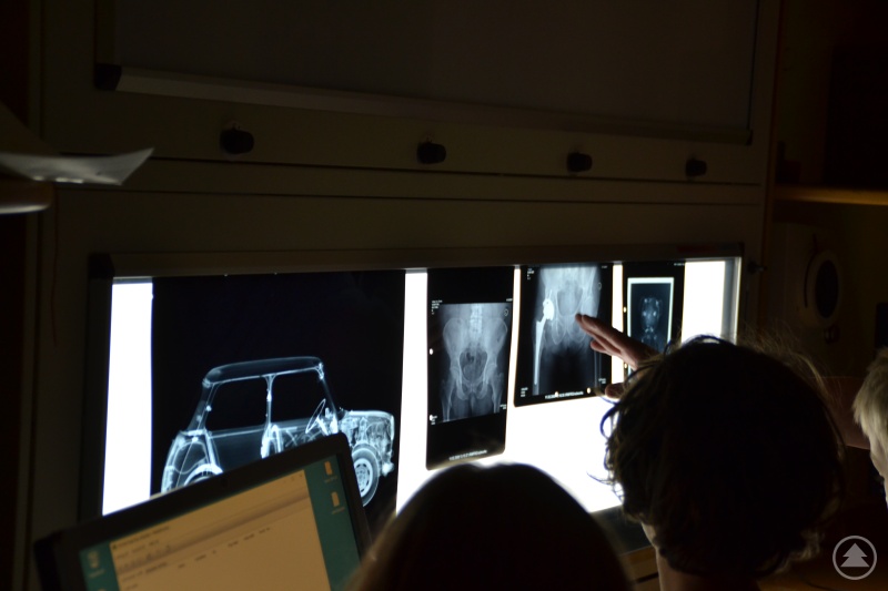 Erste Station war die Abteilung Röntgen. Hier erklärte eine Mitarbeiterin der Radiologie ausführlich, was bei einer Röntgenaufnahme passiert und welche Schutzmaßnahmen nötig sind. Abschließend wurde eine großer Kuschelbär innerlich fotografiert.