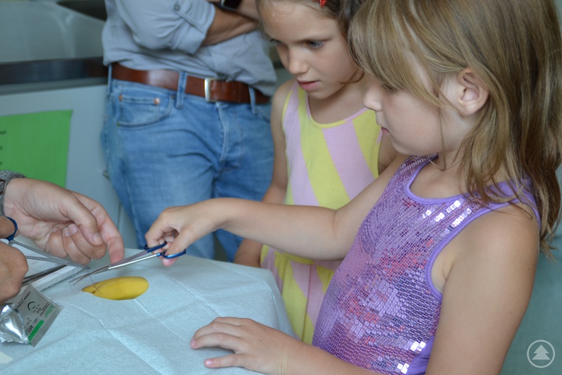 Die nächste Station war das Nähen. Am Beispiel einer Banane zeigte eine Ärztin, wie das Nähen einer Wunde funktioniert und welche Methoden es gibt, eine Wunde zu verschließen. Mit gezielten Stichen und grazilen Knoten wurde die Banane wieder heil gemacht.