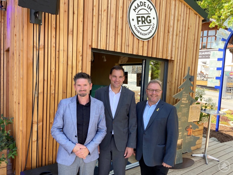 Landrat Sebastian Gruber (Mitte) mit dem neuen Pressesprecher Dr. Frederik Weinert (links) und dessen Vorgänger Sachgebietsleiter Karl Matschiner (rechts) bei der offiziellen Übergabe am Regionalpavillon des Landkreises Freyung-Grafenau auf dem Gelände der Landesgartenschau in Freyung.