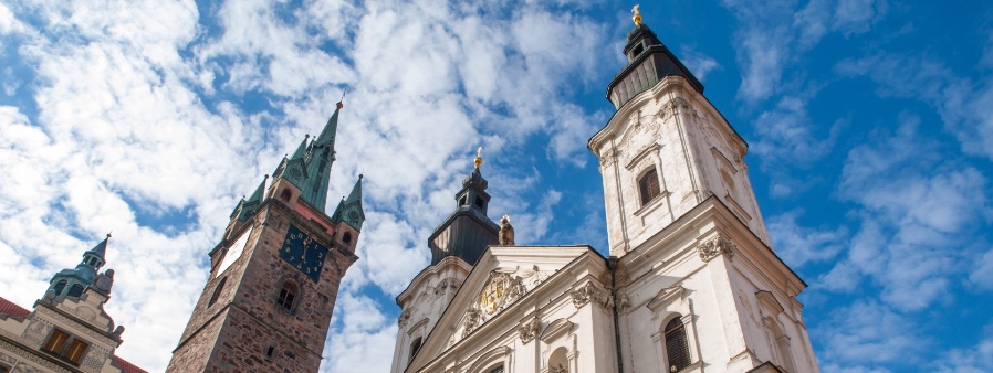 Der Schwarze Turm und die Jesuitenkirche in Klattau.