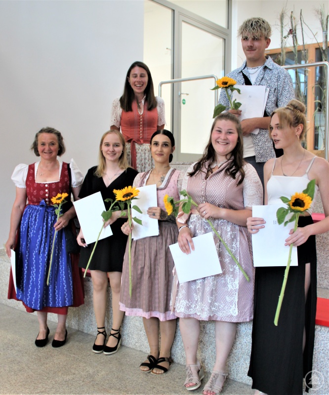 Anschließend begrüßte die Schulleiterin Andrea Feitz die Absolvent*innen in der Aula des BBZs. Sie ging auf das Thema der Schüler ein: "Danke". So dankte sie den Eltern und Lehrkräften für die Unterstützung, aber auch den Einrichtungsleitungen für die gute Zusammenarbeit gerade bei der Entwicklung der neuen Pflegeausbildung. Aber auch den Schüler*innen ist zu danken, denn sie sind nicht nur mit der neuen Ausbildungsform aktiv mitgegangen. Sie hatten auch mit den zwei Corona-Jahren zu kämpfen, die einerseits in der praktischen Ausbildung zu nie dagewesenen Herausforderungen geführt hat, anderseits auch lange Phasen Distanzunterricht mit sich gebracht haben. Dafür gab es Respekt und den Dank von Seiten der Anwesenden mit einem starken Applaus. Die stellvertretende Schulleiterin Barbara Friedl richtete ihre Worte besonders an die Schüler und Schülerinnen. Auch sie ließ die speziellen Herausforderungen dieses Jahrgangs Revue passieren. Sie ging auf das schöne und befriedigende Gefühl ein, mit einer Sache "fertig" zu sein. Dafür hielt sie auch für jeden Schüler einen entsprechenden Stempel bereit. Die Klassenleitung Julia Freilinger ging in ihrer Ansprache auf die speziellen Herausforderungen im Online-Unterricht ein, die auch für eine Lehrerin nicht ganz einfach waren - besonders wenn man lange Zeit einfach nur mit einem schwarzen Bildschirm sprechen musste. Umso mehr freute es Frau Freilinger, dass sie im letzten Schuljahr nun allen Schülern persönlich begegnen konnte.