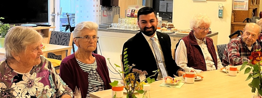 Daniela Angerer, die Leiterin der Einrichtung, nahm dieses Angebot im Namen aller Beschäftigten gerne an. Das Heim bietet 76 Plätze, 74 sind derzeit belegt, die Bewohnerinnen und Bewohner zwischen 52 und 102 Jahre alt. Betreut werden sie von 84 Mitarbeiterinnen und Mitarbeitern, informierte Daniela Angerer. Sie berichtete von einer sehr positiven Resonanz auf den Politiker-Besuch, der auf ein Versprechen am Internationalen Frauentag zurückgeht. Muhanad Al-Halak hatte den Pflegekräften Rosen gebracht und dabei war die Idee für einen Nachmittag bei Kaffee und Kuchen entstanden. Der Politiker hatte dafür selbst gebacken und auch einige Kuchenspenden bekommen. „Ich wollte den älteren Menschen mit dieser Art der Begegnung zeigen, dass sie nicht vergessen sind und mir ihre Lebenserfahrung wichtig ist. Außerdem soll es ein Zeichen an die Pflegekräfte sein, wie sehr ich ihre Arbeit schätze“, begründete Al-Halak seine Aktion.