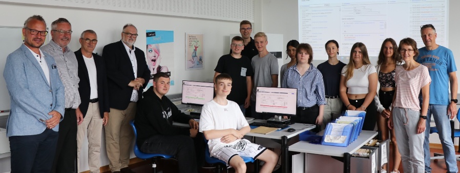 Oberbürgermeister Jürgen Dupper (4. von links) verschaffte sich mit (v.l.) Projektkoordinator Jörg Hachmeier vom städtischen Hauptamt, Hauptamtsleiter Robert Firmhofer, Schulleiter Robert Lindner sowie dem stellvertretenden Schulleiter Matthias Schmid (hinten in der Mitte) im Beisein von Schülern und Lehrern einen Überblick über das Projekt an der Wirtschaftsschule Passau.