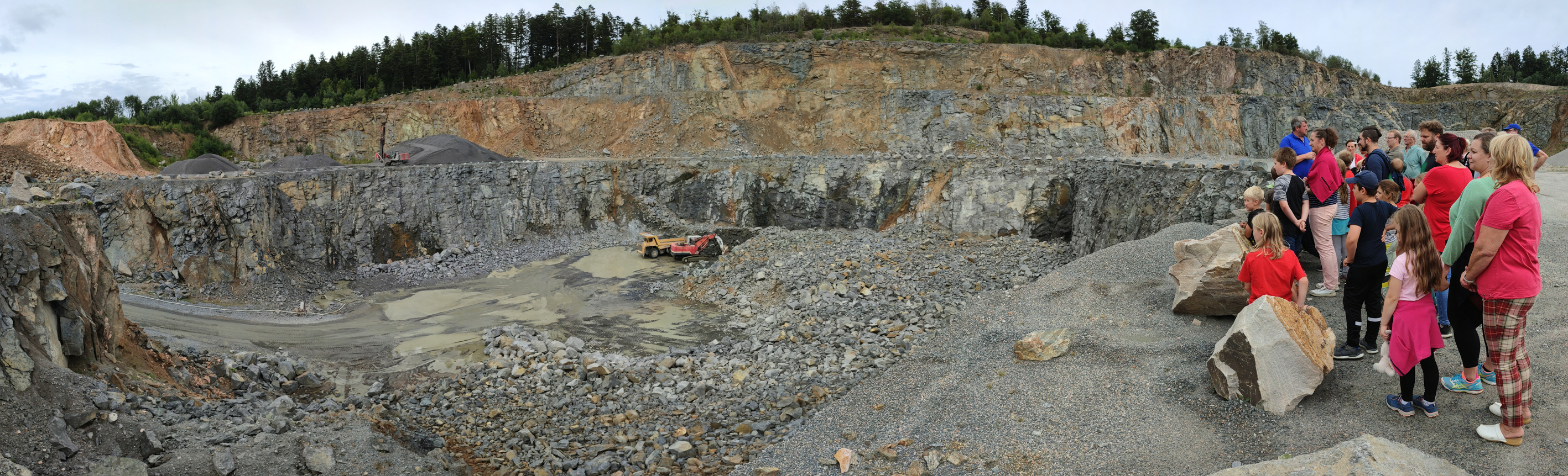 Schon zum neunten Mal gehörte der Besuch zu den Highlights der Reihe. Kein Wunder, was sonst kaum von außen zu sehen ist, das eröffnet sich aus der Nähe als ganz schön großes und tiefes Loch in der Landschaft. Am Rand der Abbaustelle wirken die Bagger und Muldenkipper ganz unten wie Miniaturen aus dem Spielzeugladen. Nur das mächtige Rumsen und Schlagen verrät, dass hier pro Fuhre schon mal bis zu 55 Tonnen Gestein abtransportiert und in eine riesige Brecheranlage geschüttet werden.