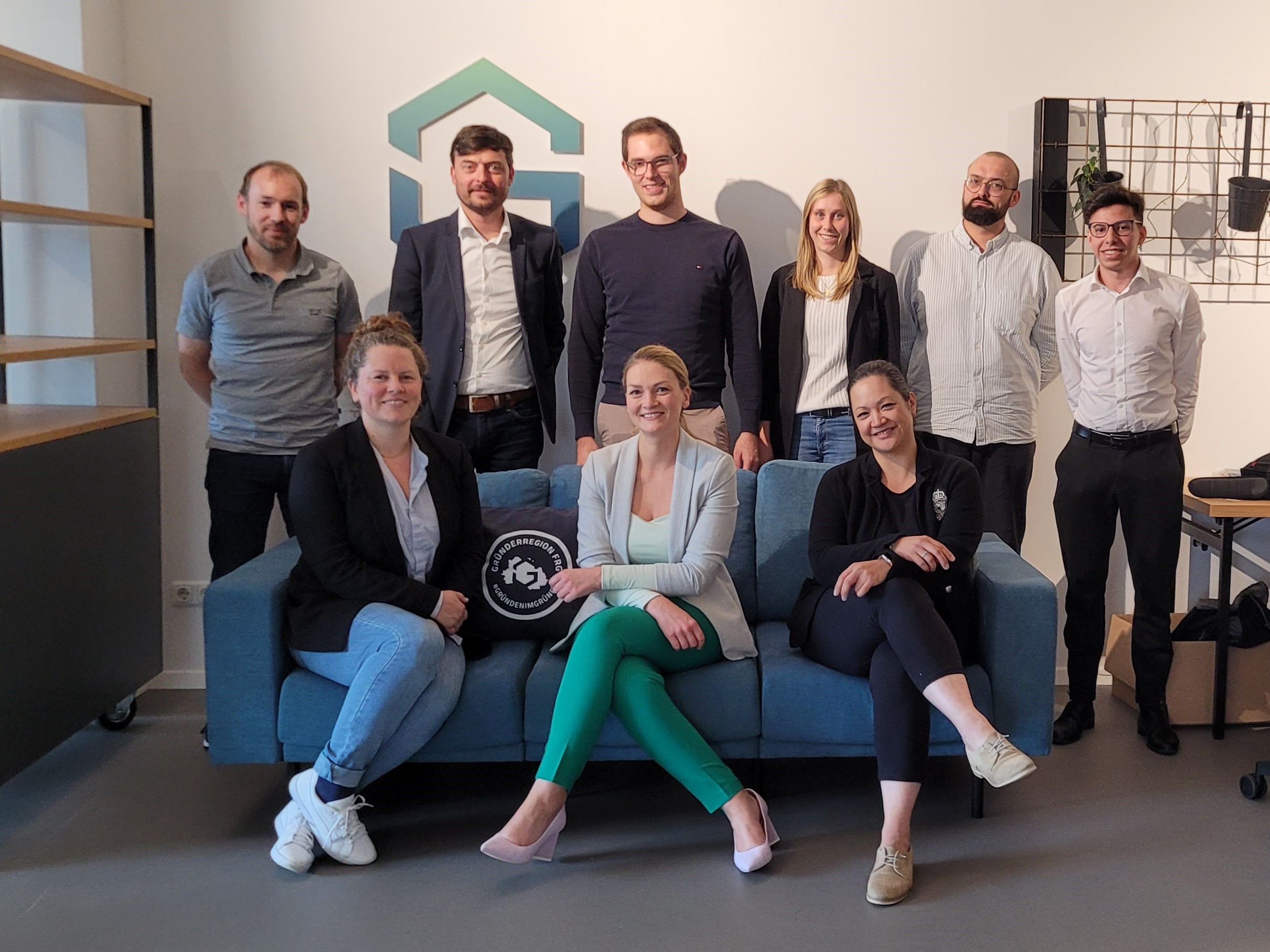 Trafen sich für einen spannenden Austausch zum digitalen Gründungsgeschehen im Landkreis: Digitalministerin MdL Judith Gerlach (Sofa Mitte) mit GreG FRG Geschäftsführerin Stephanie Fichtl (Sofa links) und Prof. Dr. Wolfgang Dorner (stehend, 2. v.l., Wissenschaftlicher Leiter Technologie Campus Freyung, 2. Vorsitzender GreG Freyung-Grafenau e.V.), sowie den Gründern und Netzwerkmitgliedern (v.l.) Johannes Fürst (IFOX Systems GmbH), Dr. Maximilian Freyenfeld (FREYENFELD MEDIA UG.), Corina Molz (ILE Ilzer Land), Johannes Plate (101Lab), Josef Straka und Christine Knaus (Sofa rechts, C85 GmbH)
