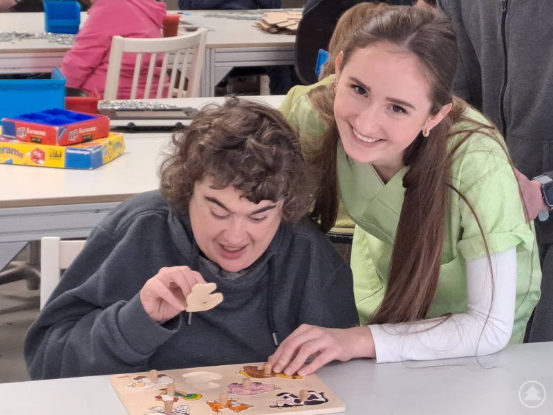 Sie hilft den Menschen mit Handicap bei der Arbeit, wenn die Hand nicht so kann, wie der Kopf es vorgibt, wenn Bewegungen nun einmal schwer zu koordinieren sind. Sie stellt die Brotzeit zusammen, alles individuell. Sie knetet mit den behinderten Menschen im Alter von 21 bis 58 Jahren Salzteig für den Bastelnachmittag. Das Individuum steht bei der jungen Frau im Mittelpunkt. Dennoch: immer wieder der Blick in die Gruppe. Überblick behalten über die Arbeitstische, die Rollis, die Kolleg*innen mit Behinderung. Intensivgruppe meint auch intensive Betreuung jeder einzelnen Person. Am Vormittag Arbeit, am Nachmittag Basteln, Spielen, Bewegung je nach individuellen Möglichkeiten.