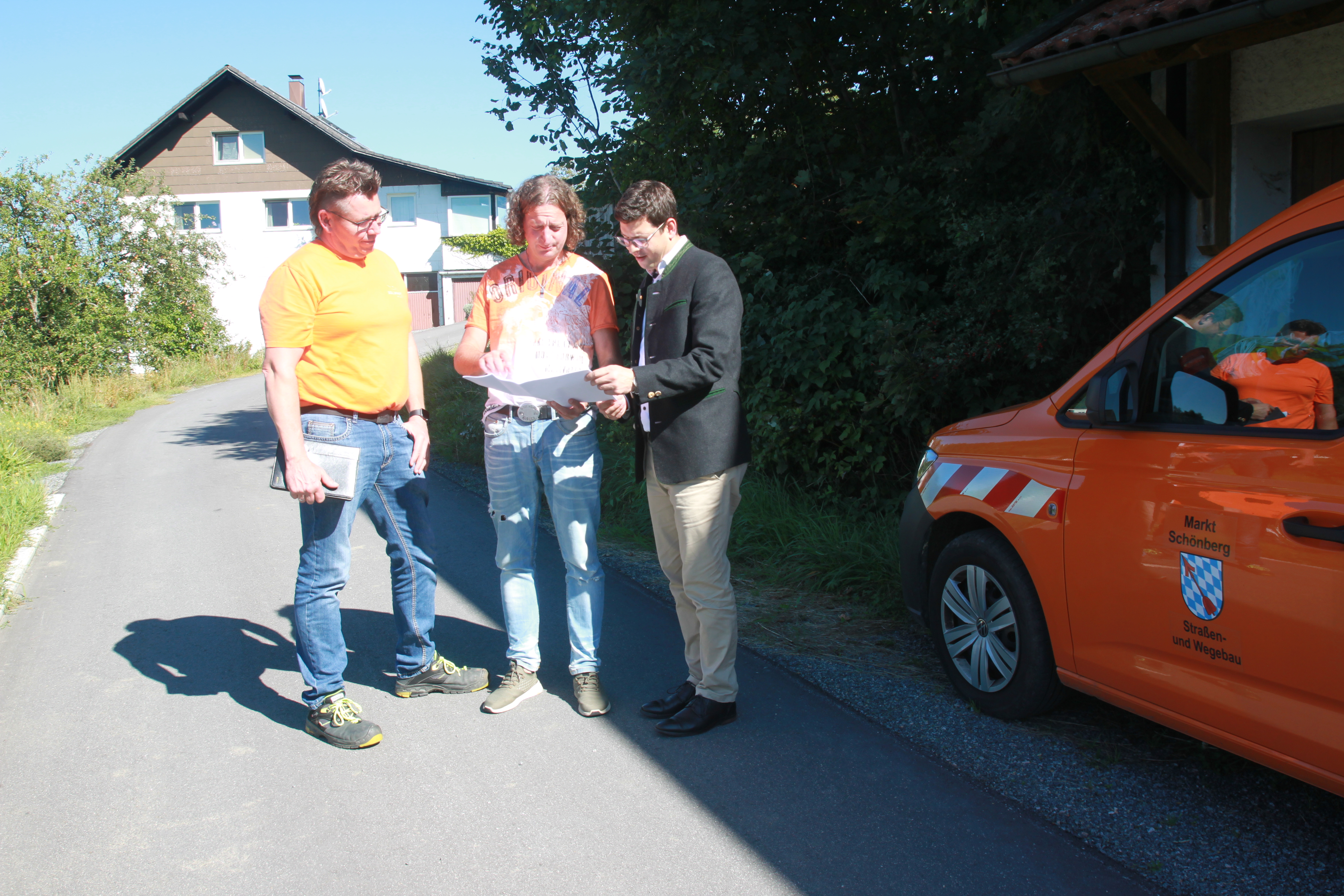 Zum Glück war der Unterbau bisher bereits recht solide, wie Markus Christoph vom Bauamt und Jürgen Murr vom Bauhof feststellen konnten. Dennoch wurden etwa 100 Tonnen Frostschutz und Bankettmaterial benötigt, bevor 210 Tonnen glatter Asphalt auf knapp 200 Metern Länge und 620 Quadratmetern Fläche gelegt und gewalzt wurden. Fünf Straßenabläufe, ein Abflussrohr und 80 Meter Granithochbord sorgen für die benötigte kontrollierte Entwässerung. So viel wie möglich wurde vom Bauhof zudem selbst erledigt, um damit Kosten zu sparen.