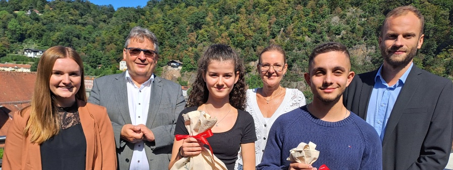 Sina-Marie Schulz (16) und Johannes Schlappinger (21) haben in der Zentrale ihre Ausbildung im Büromanagement angetreten. Die Caritasvorstände Mag.a (FH) Andrea Anderlik, MSc und Diakon Konrad Niederländer sowie der Personalchef Thomas Furthmeier und Sabrina Hoffmann, Ausbildungsleiterin, haben sie am Montag, 4. September, willkommen geheißen. Auf die Azubis, so Diakon Niederländer, warten vielfältige Dienste der Caritas, interessante und sichere Arbeitsplätze. Als einer der größten Arbeitgeber in der Region bietet die Caritas viele Möglichkeiten nach der Ausbildung übernommen zu werden. Sina-Marie Schulz hat in der Personalabteilung begonnen, Johannes Schlappinger in der Kita-Abteilung.