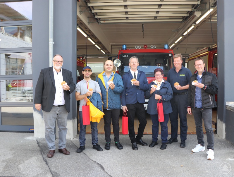Oberbürgermeister Jürgen Dupper (Bild links) bedankt sich zusammen mit Stadtbrandrat Andreas Dittlmann (2. v. rechts) und dem Leiter des Ordnungsamtes der Stadt Passau Erik Linseisen (Bild rechts) bei den Mitarbeiterinnen und Mitarbeitern des Mc Donald´s für die Burger-Spende.
