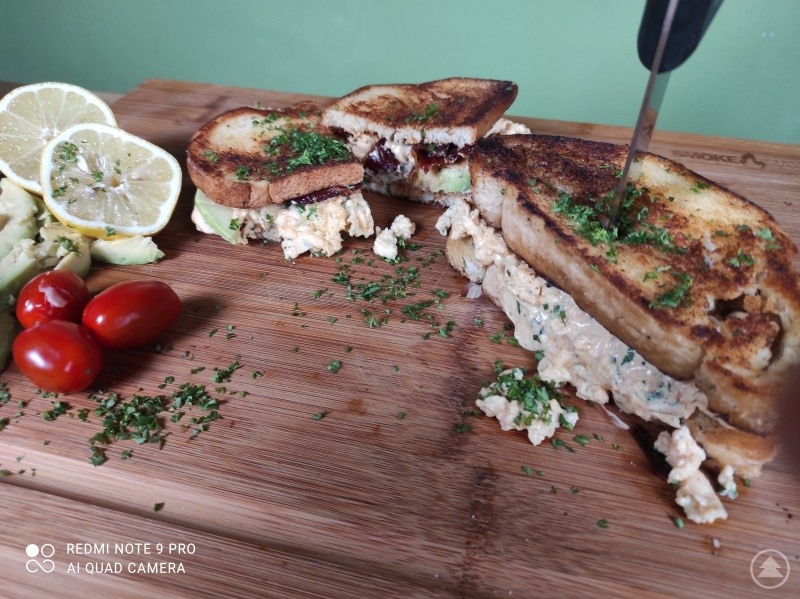 Genieße dieses köstliche Egg Drop Sandwich mit seiner cremigen Ei-Füllung, dem herzhaften Speck, der samtigen Avocado und der würzigen Mayo – ein Geschmackserlebnis, das deine Geschmacksnerven verwöhnen wird!