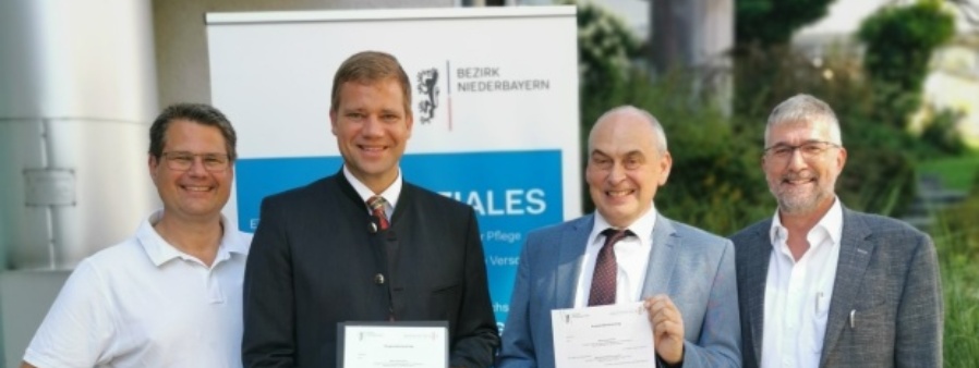 Beim offiziellen Pressetermin zur Vertragsunterzeichnung der Kooperation – (v.l.) Kinderklinik-Chefarzt Prof. Dr. Matthias Keller, Bezirkstagspräsident Dr. Olaf Heinrich, Kinderklinik-Geschäftsführer Reinhard Schmidt und Stefan Eichmüller vom Bezirk Niederbayern