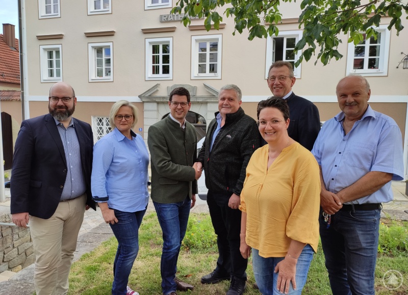 Dem Vorstand Werner Köckeis (Mitte) wünschte Bürgermeister und Verwaltungsratsvorsitzendem Martin Pichler per Handschlag gutes Gelingen. Für den Verwaltungsrat stehen die Räte Markus Roth (weitere v.l.), Carolin Garhammer, Veronika Egger und Karl Schneck zur Seite. Günther Kellermann wirft als Kämmerer der Marktgemeinde den Blick auf die Zahlen, die für die Kommune positiv ausfallen sollen